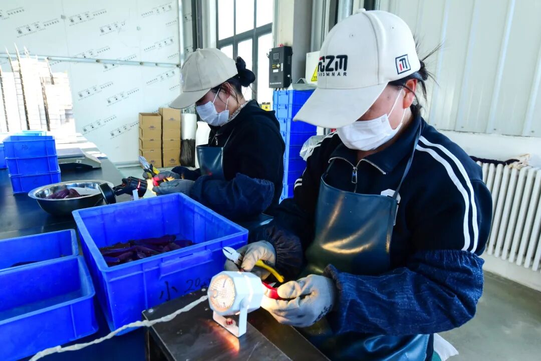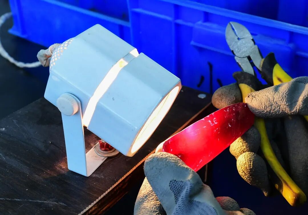 在包装车间,两名女工在质检台前借助灯光检查红宝石的质量,检查无误后,按不同等级将红宝石装入2KG的包装盒中,待产品达到一定数量即被发走。