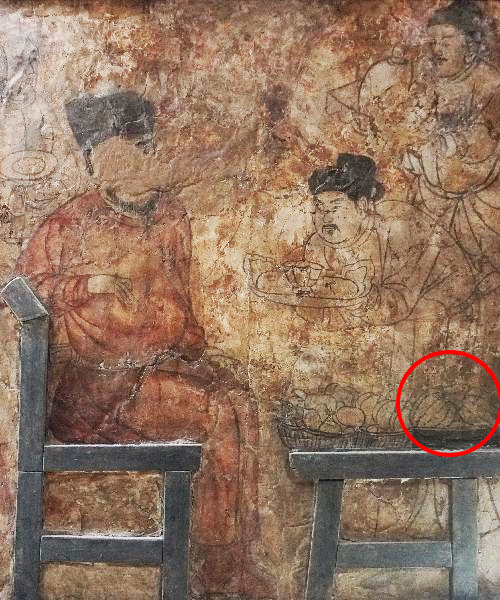 ▲《宴饮图》中出现了石榴、西瓜(右)等水果。新华网发 李富 摄