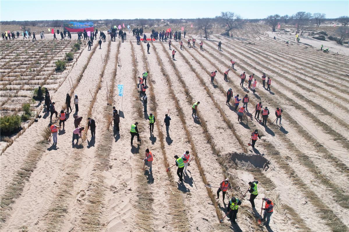 通辽市科尔沁沙地歼灭战项目区铺设沙障。(资料图)