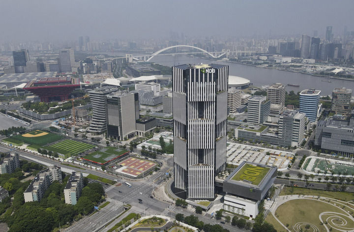 这是2022年6月17日拍摄的位于中国上海浦东新区世博园区的金砖国家新开发银行总部大楼(无人机照片)。新华社记者 方喆 摄