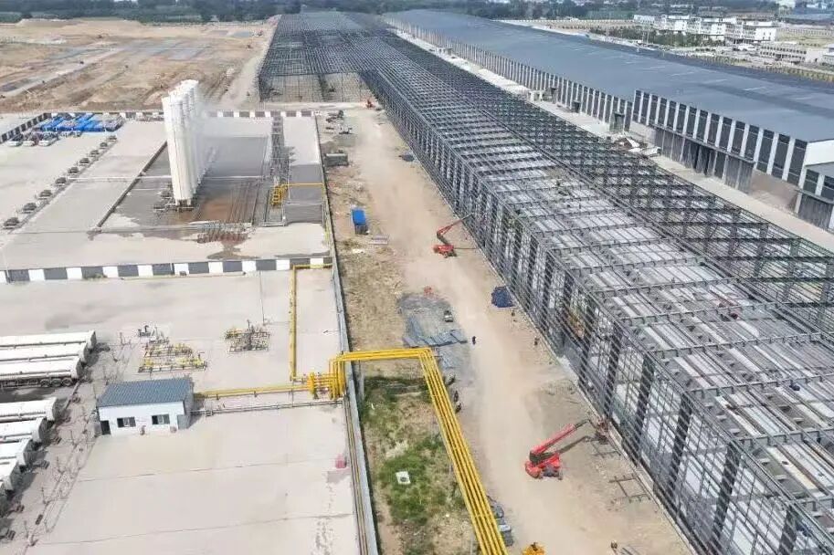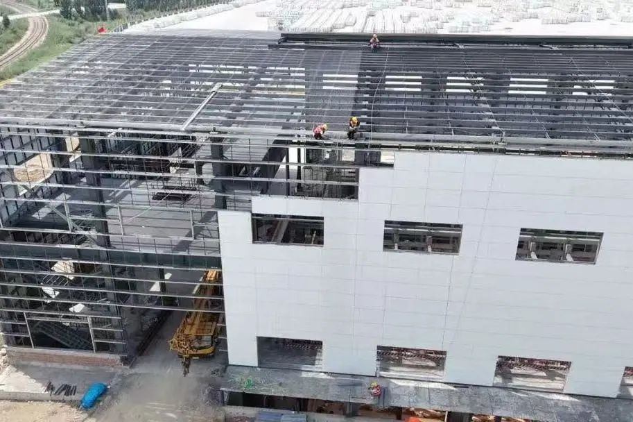 一期项目总投资11亿元,已于2022年8月投产,年产东方晶硅新材料600万平方米,年产值约7.2亿元,安置就业500人。二期项目已于2024年7月开工建设,总投资约13亿元。在阳光的照耀下,钢铁骨架初具雏形。目前,车间主体建设已完成,近期购置设备和生产线安装。建成后,年产东方晶硅新材料约600万平方米,年产值约13.2亿元,安置就业800人,计划于2025年10月建成投产。