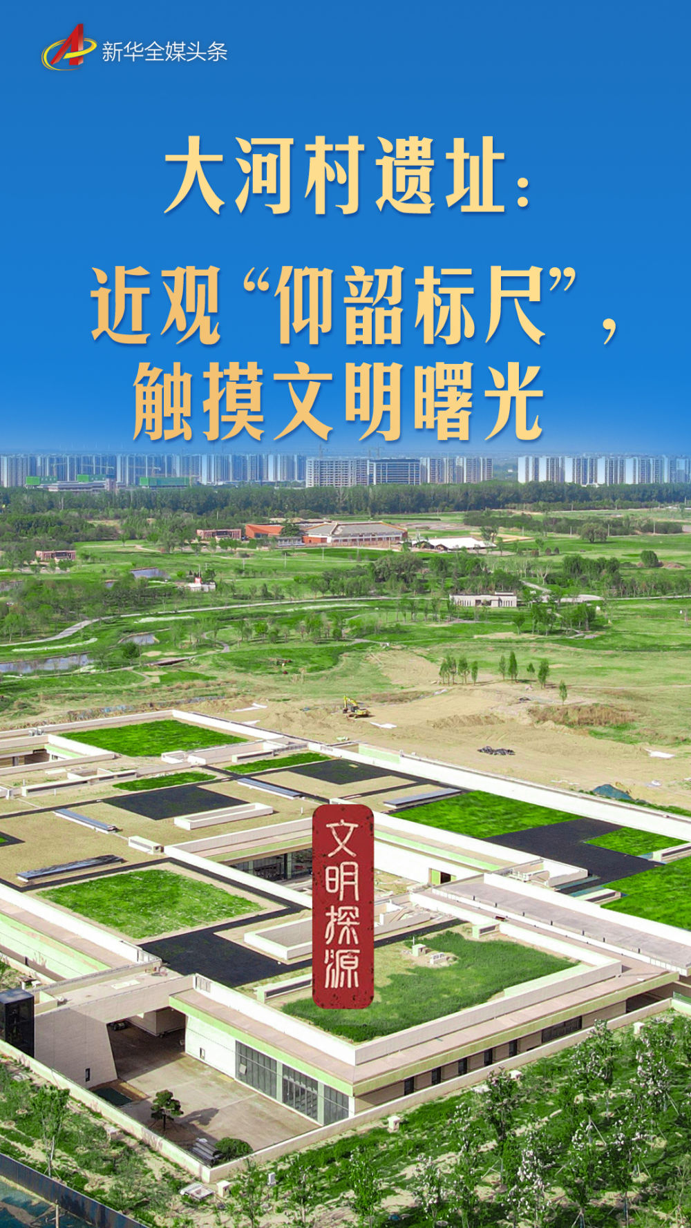 从空中俯瞰,这座设计上别出心裁的“下沉式”博物馆,与绿意盎然的大河村国家考古遗址公园融为一体——泥土之下,黄河流域中华文明起源阶段完整而连续的文化风貌层层叠压。
