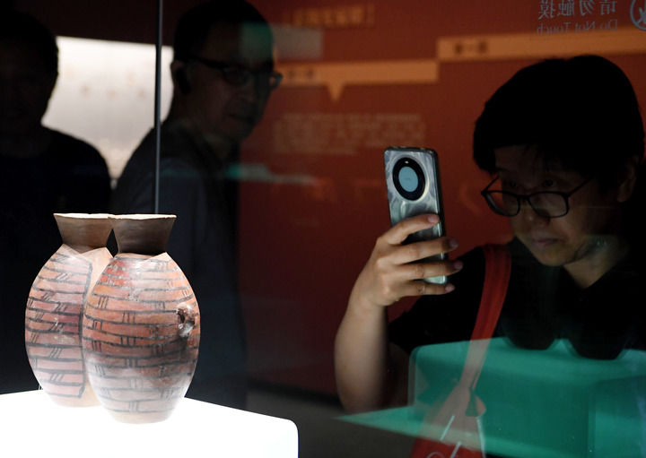 2025年6月14日,参观者在大河村遗址博物馆新馆内拍摄展品彩陶双连壶。新华社记者 郝源 摄