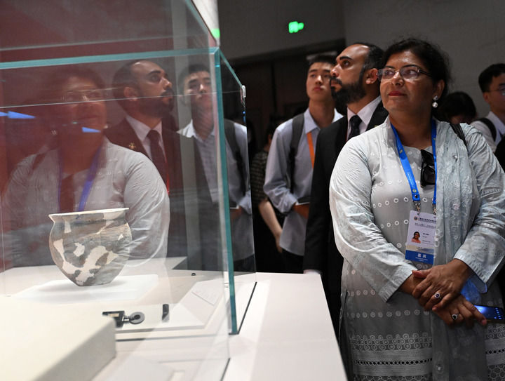 2025年7月24日,上海合作组织媒体智库峰会子活动“文化遗产保护利用交流合作会”的参会嘉宾在郑州大河村遗址博物馆新馆参观。新华社记者 李嘉南 摄