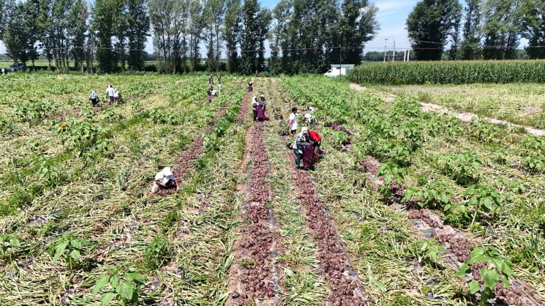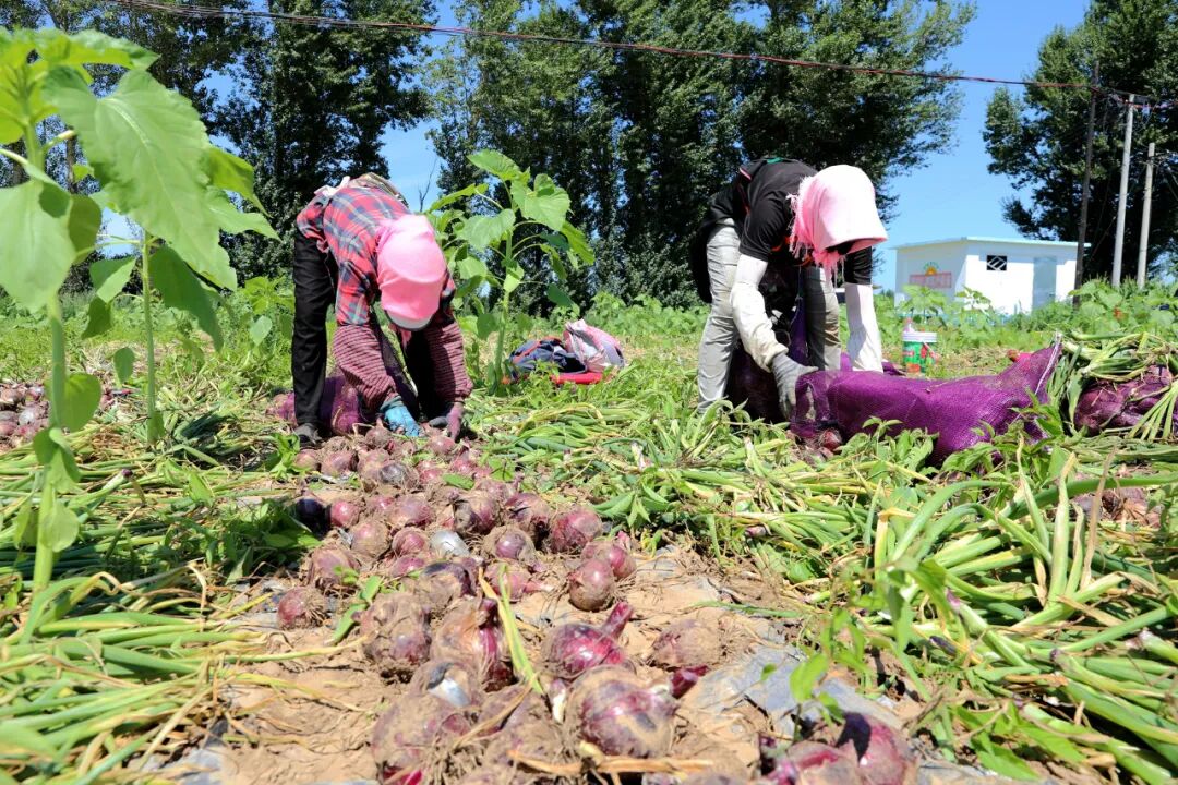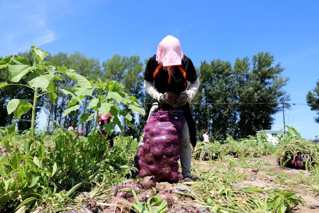 不仅设施农业蓬勃发展,大田圆葱同样喜获丰收。一袋袋洋葱堆放在垄沟之间,工人们正忙着将采收的圆葱进行分拣、筛选、装袋。村民杨清香从春季栽种起便在此务工,“有活就干,最多的时候一天能赚270多元,离家近、还能照顾家里,挺好的。”杨清香算了一笔收入账,一年仅靠就近务工就能收入2万余元。