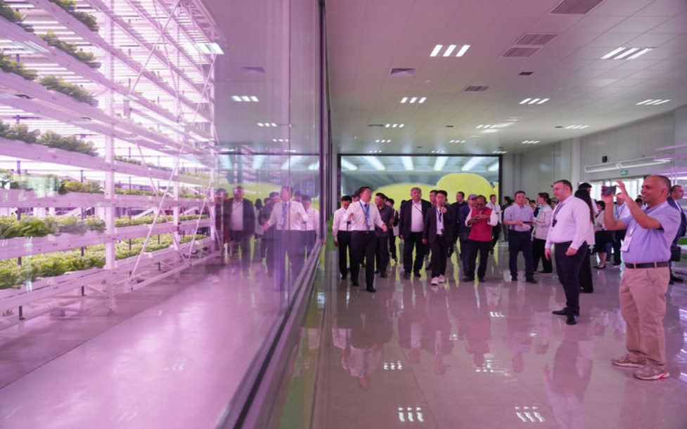 5月19日,上海合作组织减贫和可持续发展论坛与会人员在陕西杨凌智慧农业示范园进行实地考察。新华社记者 邵瑞 摄