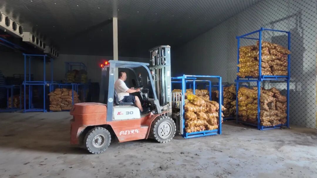 在冷库门口,奈曼旗金丰公社农业服务有限公司总经理史明华正用叉车往库里运土豆。筐子里的土豆裹着新鲜泥土,在冷风机的徐徐凉风里,仿佛进入了时光停滞的“保鲜舱”。