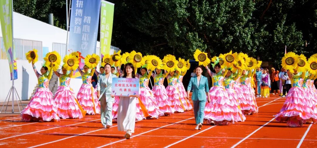 入场式不是简单的“才艺展演”,而是集团“和而不同”教育生态的鲜活隐喻。南北校区各1分钟特色展示与5分钟联合展演,构成“各美其美—美美与共”的叙事逻辑:七年组以“耕耘者”形象演绎“起始年级的育人初心”,八年组以“攀登者”姿态诠释“承上启下的成长护航”,九年组以“领航者”身份呼应“中考攻坚的责任担当”,行政组则以“服务者”角色,展现“幕后支撑的坚实力量”。