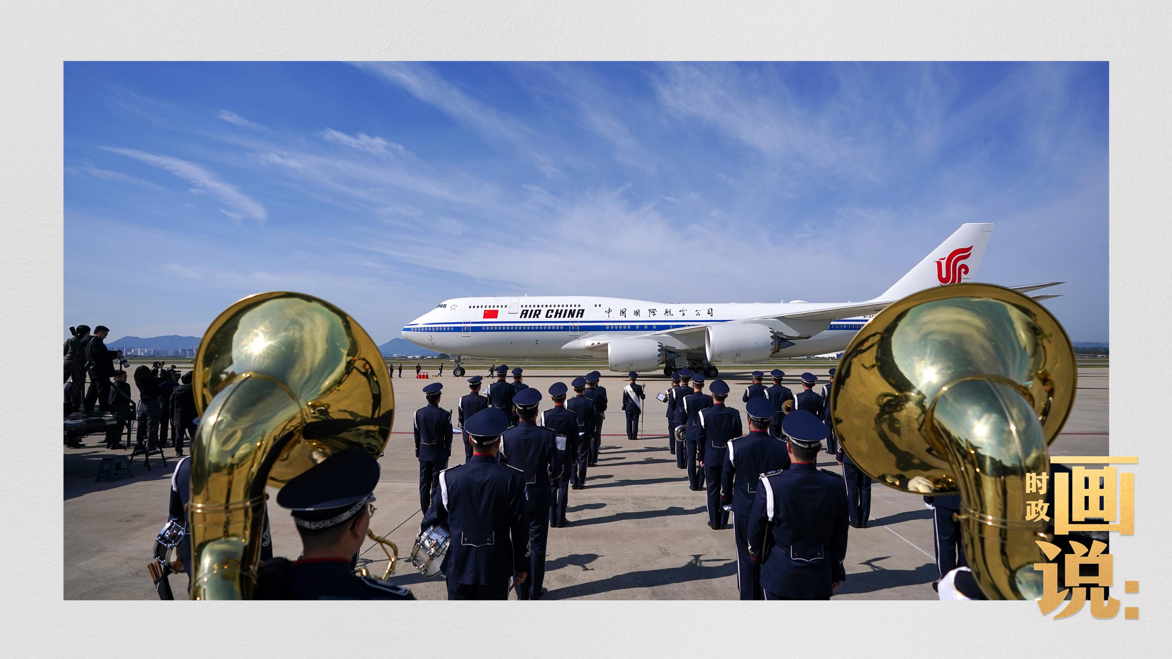 习近平抵达釜山金海国际机场时,韩国外长赵显等高级官员热情迎接。礼兵分列红地毯两侧致敬,军乐团演奏行进乐,机场鸣放21响礼炮。