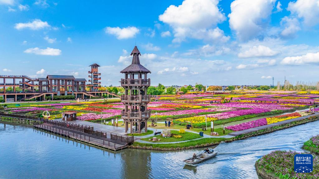 11月2日,游客在江苏省兴化市千垛景区赏菊游玩(无人机照片)。深秋时节,景色绚烂,全国多地迎来赏秋热潮。新华社发(周社根 摄)