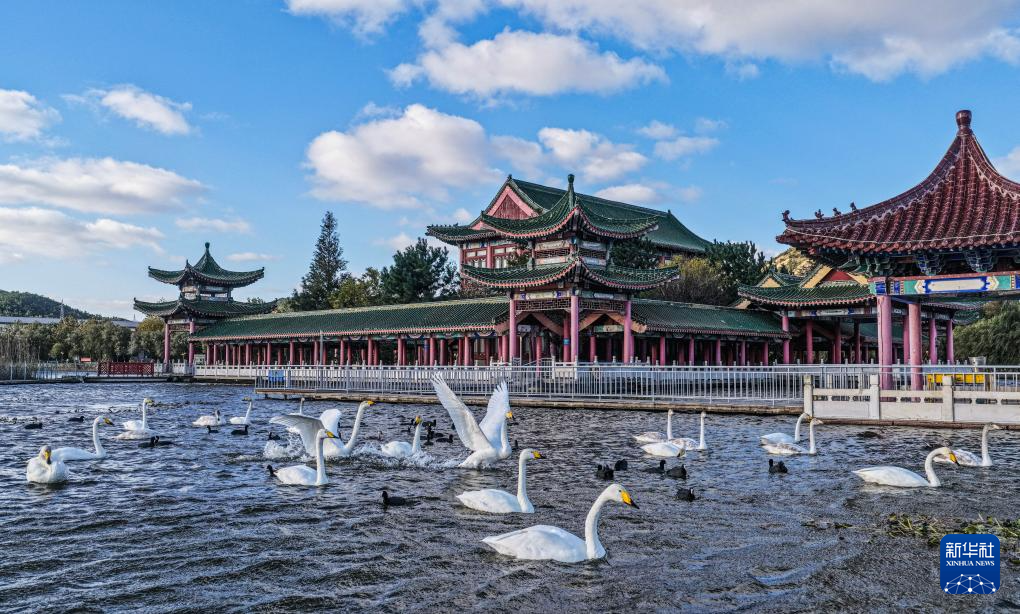 11月2日,在山东省荣成市成山镇西霞口隆霞湖公园,大天鹅在栖息、觅食(无人机照片)。深秋时节,景色绚烂,全国多地迎来赏秋热潮。新华社发(李信君 摄)