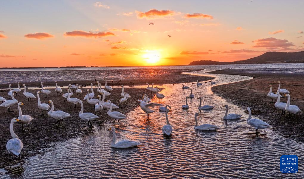 11月2日,在山东省荣成市成山镇天鹅湖湿地,大天鹅在栖息、觅食(无人机照片)。深秋时节,景色绚烂,全国多地迎来赏秋热潮。新华社发(李信君 摄)