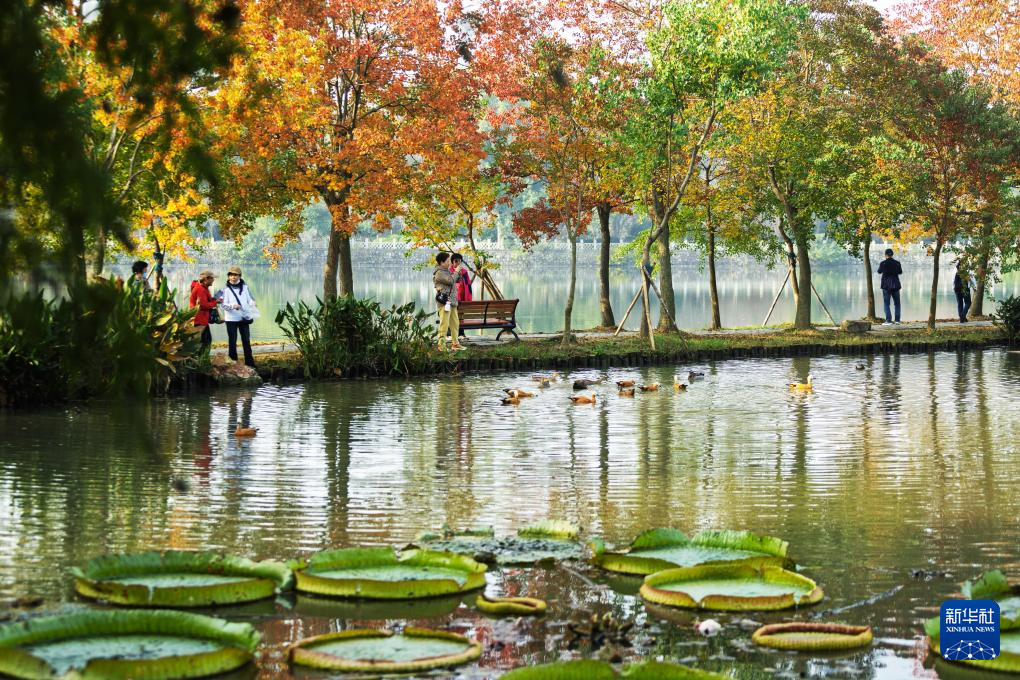 11月2日,人们在南京中山植物园月牙堤上观赏秋景。深秋时节,景色绚烂,全国多地迎来赏秋热潮。新华社发(孙忠南 摄)