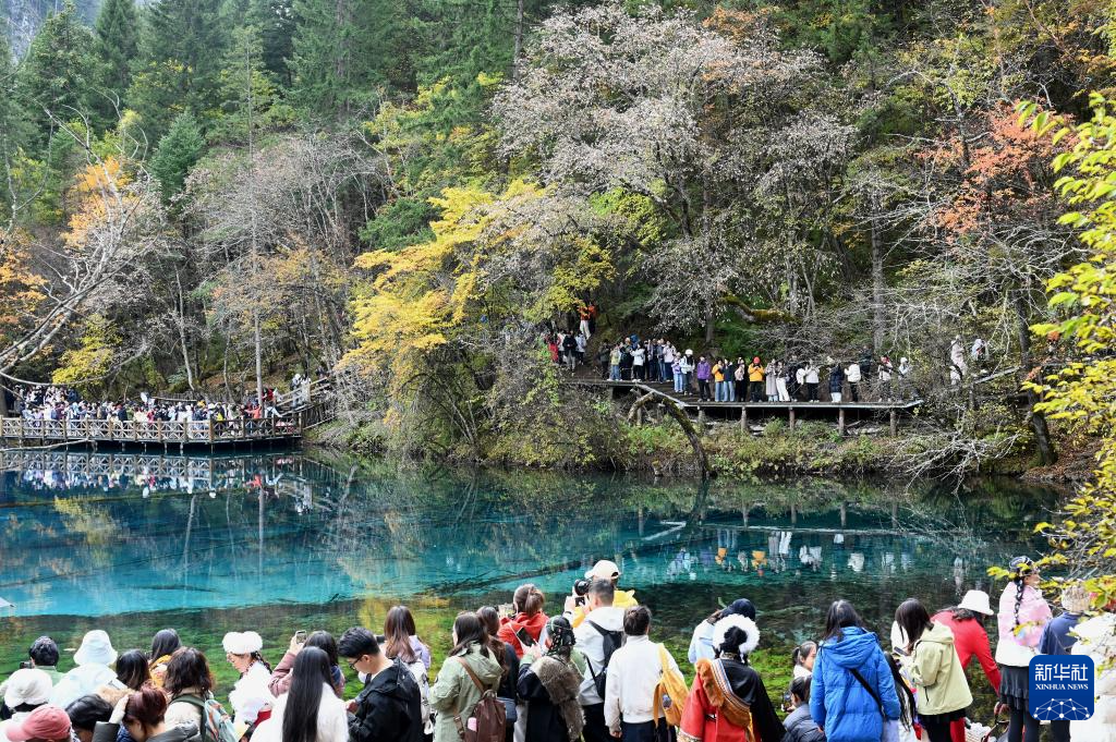 11月1日,在四川省阿坝藏族羌族自治州九寨沟县,游客在九寨沟风景区游玩。深秋时节,景色绚烂,全国多地迎来赏秋热潮。新华社发(兰自涛 摄)