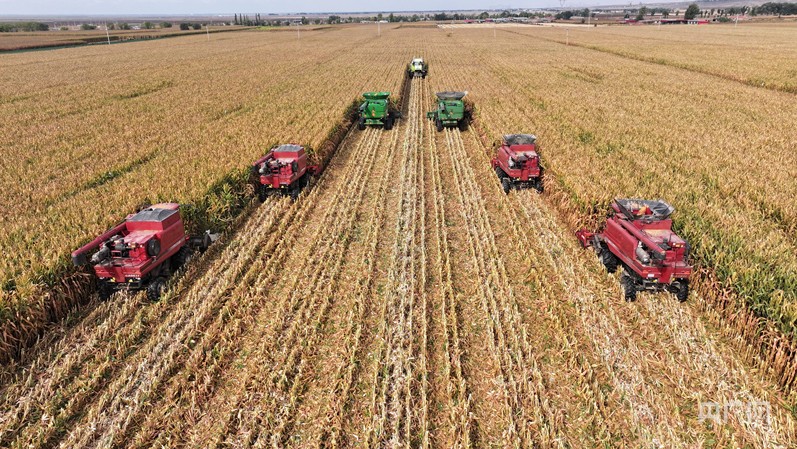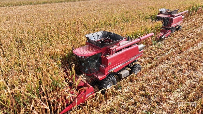 航瞰玉米收割现场(央广网发 谢佳卉 摄)