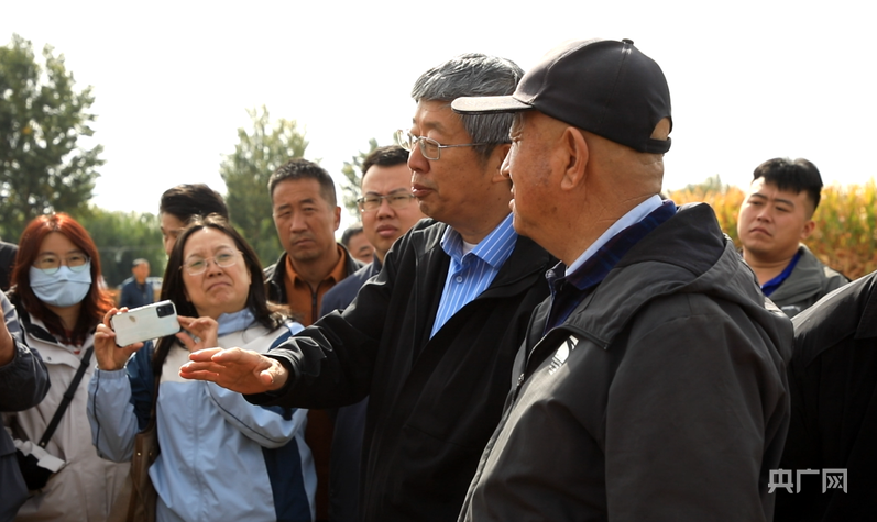 中国农科院研究员、农业农村部玉米单产提升工程专家指导组组长李少昆(左)与种植户交流(央广网发 王泽浩 摄)