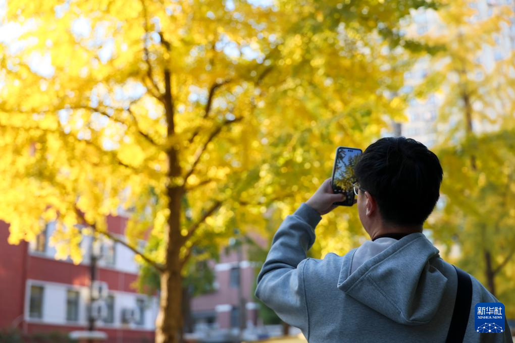 11月30日,市民在上海市黄浦区局门路拍摄银杏。初冬时节,各地五彩斑斓,构成浓墨重彩的初冬画卷,美不胜收。新华社记者 王翔 摄