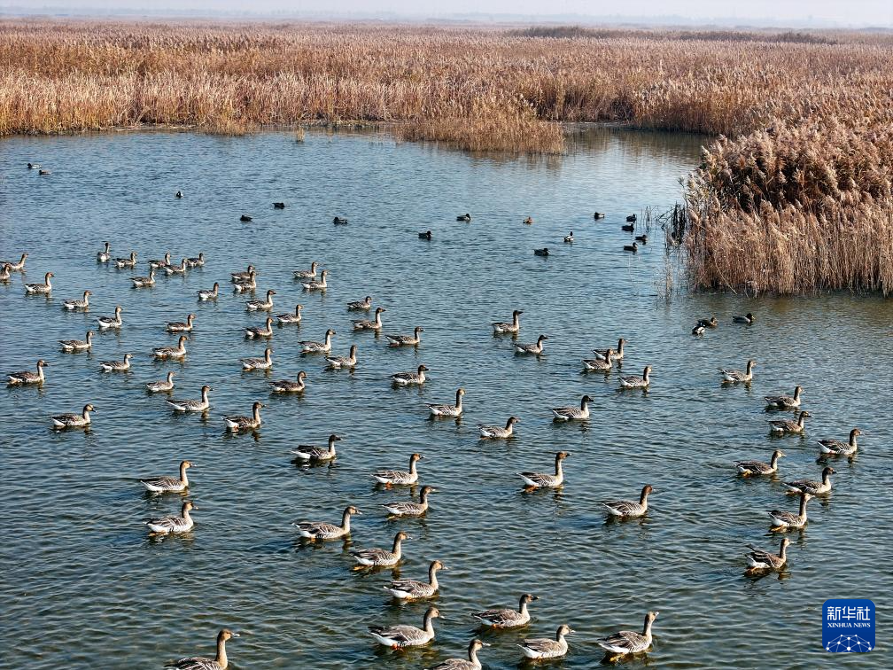 11月30日,群鸟在江苏兴化里下河国家湿地公园内栖息、觅食(无人机照片)。初冬时节,各地五彩斑斓,构成浓墨重彩的初冬画卷,美不胜收。新华社发(周社根摄)