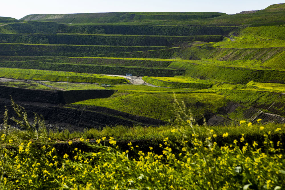 夏日里的露天煤矿,草木葱茏,生机勃勃。披碱草、紫花苜蓿、草木樨等优质牧草在矿山间蔓延成片,蓝天与绿野交织,构成一幅碧草连天的动人画卷。
