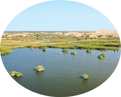 密密的锁边林如同一条金色的丝带沿着沙漠边缘蜿蜒,将沙粒细小、金黄闪亮的沙海紧紧环绕。连片的沙蒿、柠条、花棒相互交织,组成了一个庞大的金色网络。偶尔有狐狸灵动的身影在沙丘间一闪而过,成千上万只鸟儿哗啦啦地掠过林梢,斑斓风景映照在七星湖上。库布其——这片曾被称为“死亡之海”的大漠,早已今非昔比。