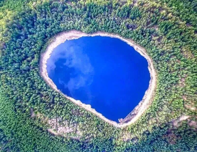 航拍下的阿尔山天池犹如蓝宝石镶嵌在高山之巅。