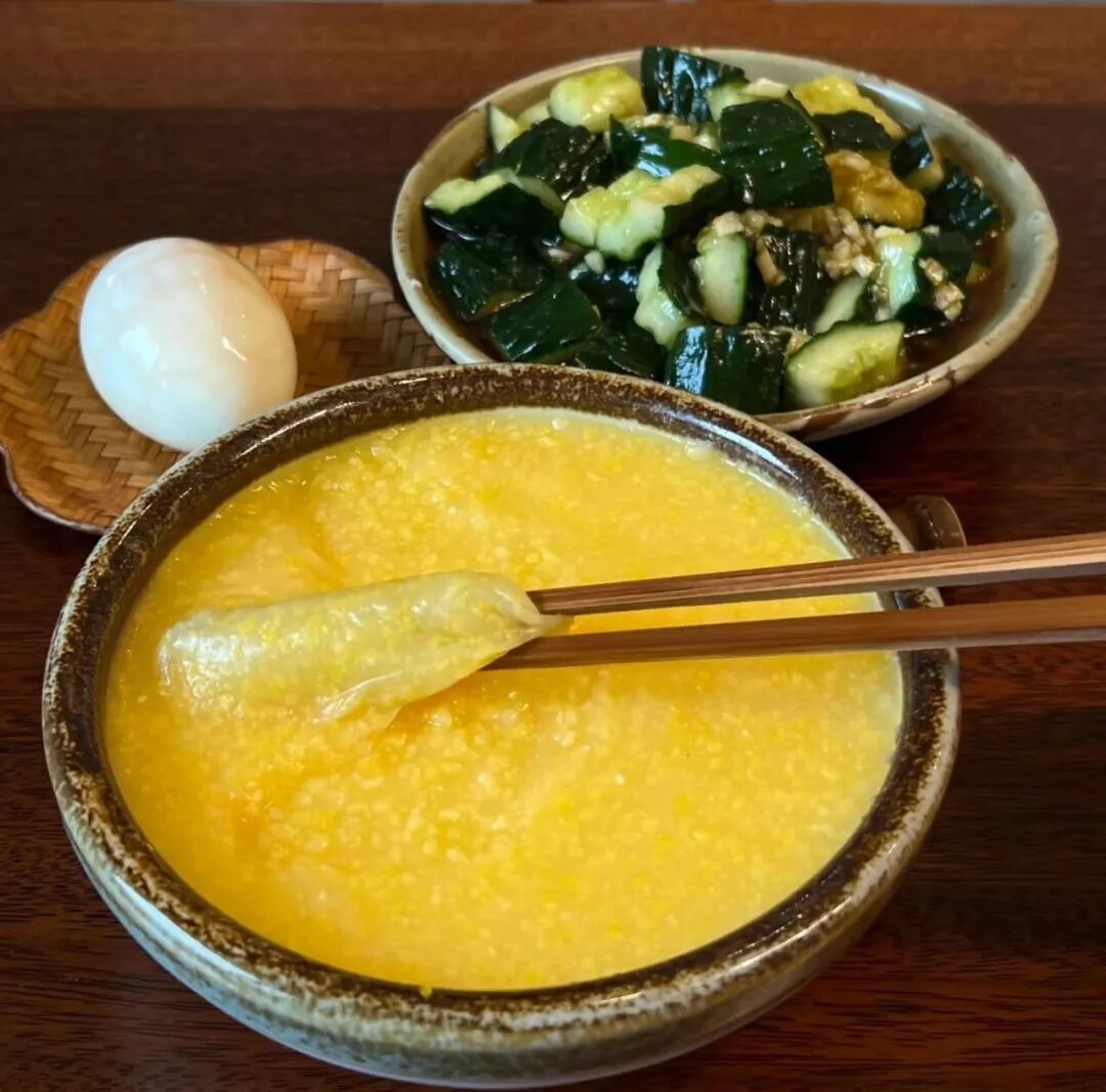 玉米糁粥配咸菜丝:浓稠的玉米糁粥熬得软糯香甜,搭配爽脆的咸菜丝,清淡解腻,暖心又暖胃。