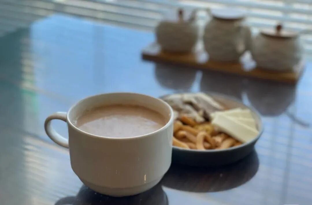 热奶茶:现煮的奶茶醇厚丝滑,咸甜交织,喝上一杯,瞬间驱散滑雪后的寒意,浑身都暖乎乎的。