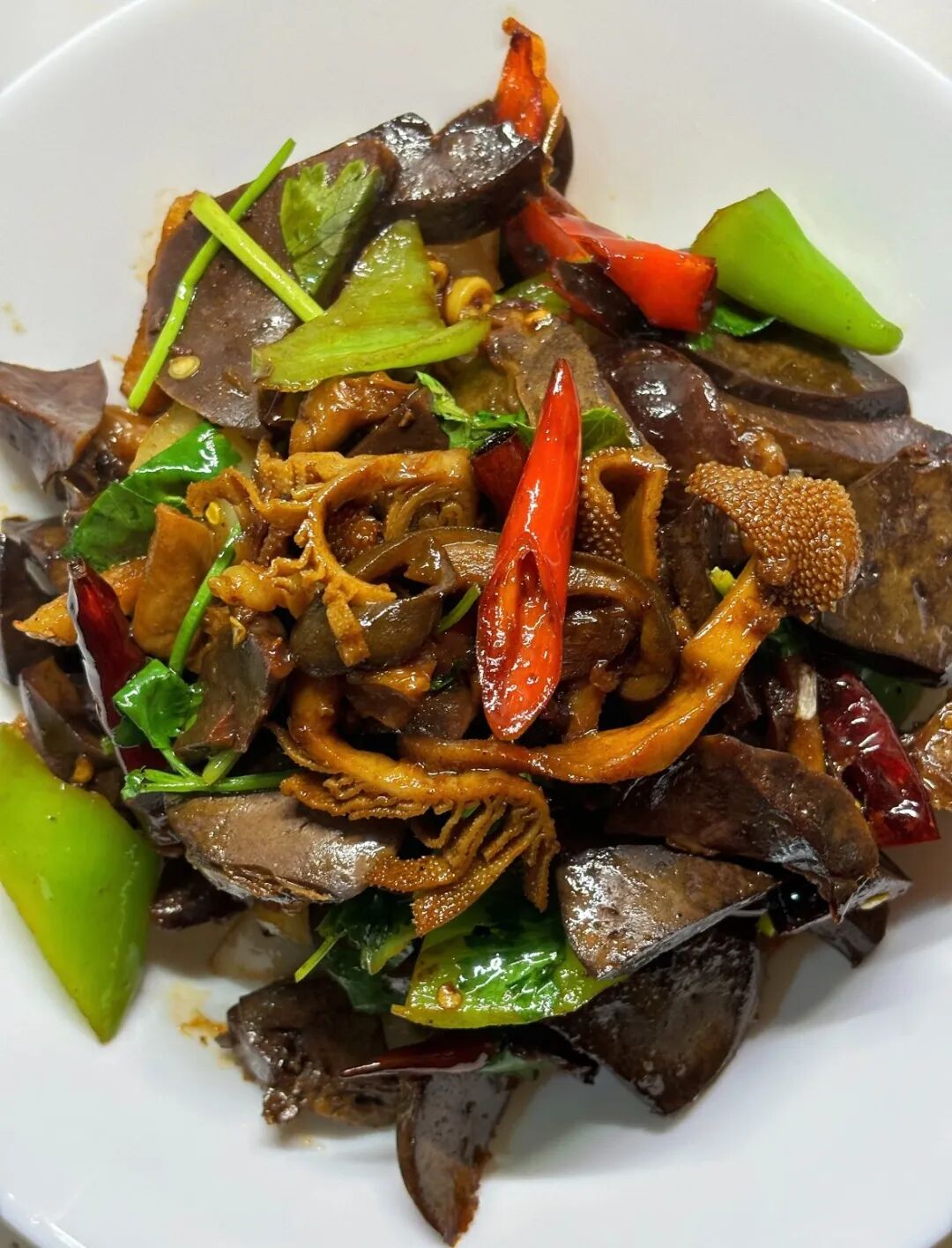 通辽炒羊杂:新鲜的羊杂经过爆炒,口感鲜香有嚼劲,搭配蒜末和香菜提味,香辣过瘾,配米饭能多吃两碗。