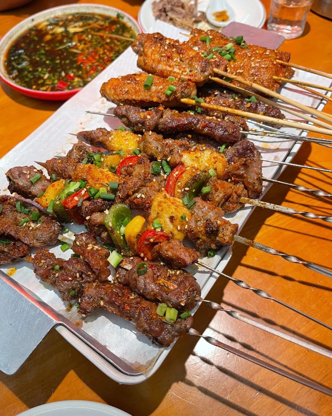 烤黄牛肉串:霍林郭勒的黄牛肉质紧实弹牙,用炭火慢烤,撒上孜然、辣椒面,炭火香气与牛肉的鲜香完美融合,越吃越上头。
