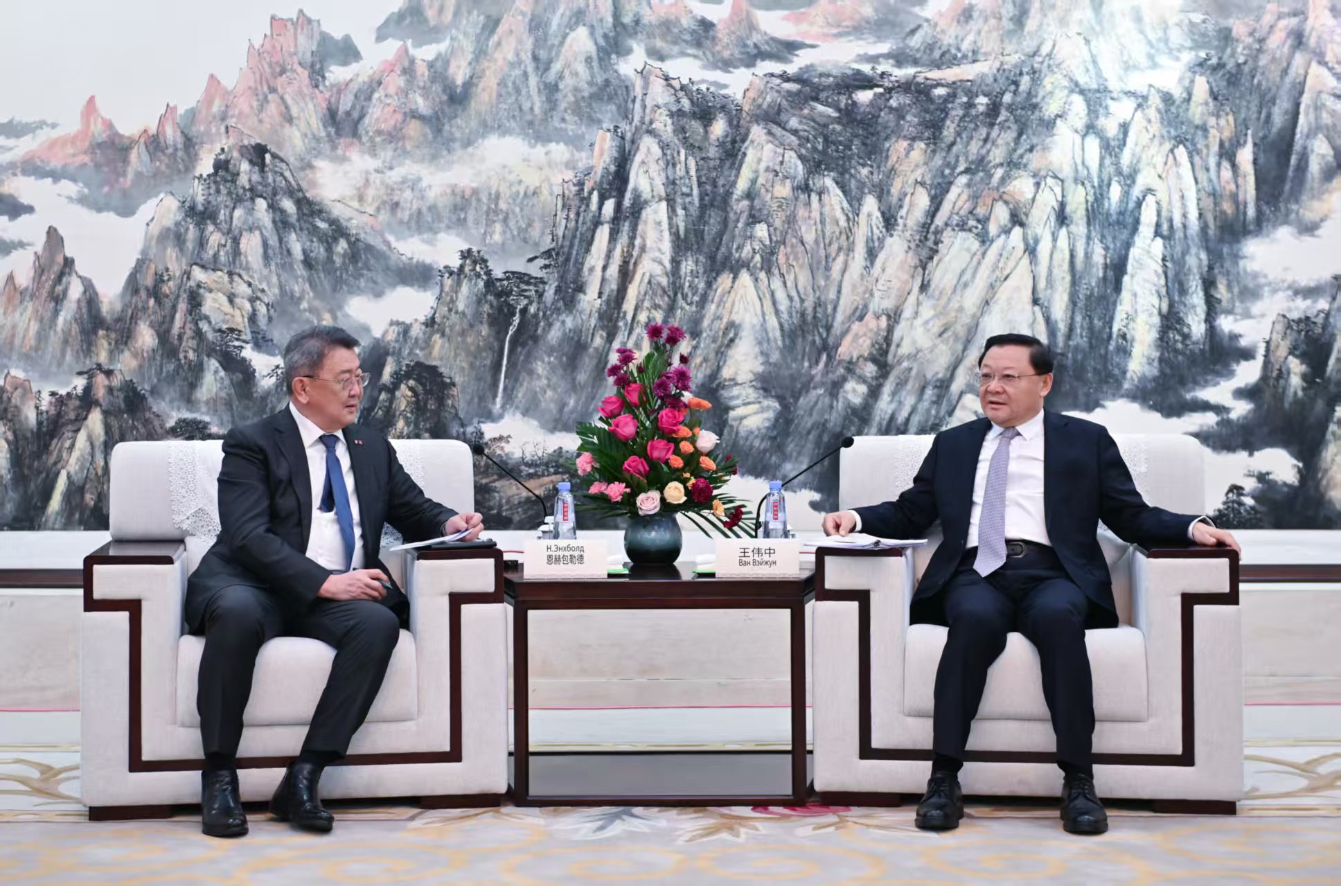王伟中代表自治区党委和政府对恩赫包勒德一行表示热烈欢迎,对蒙古国驻华使领馆为推动内蒙古自治区与蒙古国的全方位合作作出的积极努力表示衷心感谢,并回顾了内蒙古自治区与蒙古国友好交往交流情况,宣介了中共二十届四中全会精神和内蒙古自治区发展现状。他说,近年来,中蒙两国元首达成的重要共识为双方的合作指明了方向。内蒙古自治区与蒙古国地理相邻,在发展中蒙两国友好合作关系方面具有独特地位和作用,并且与蒙古国在很多领域具有互补优势,合作潜力巨大,前景广阔。我们希望在建设国家向北开放重要桥头堡的进程中进一步加强与蒙古国的合作,愿同蒙古国有关方面一道,认真落实两国元首达成的重要共识,进一步完善合作机制,加强铁路、公路、电网、口岸等互联互通建设,深化社会人文领域交往交流,持续加强能源资源和生态环保领域的务实合作,推动实现更宽领域、更深层次、更高水平的互利共赢,为深化中蒙全面战略伙伴关系、共建两国命运共同体作出贡献。