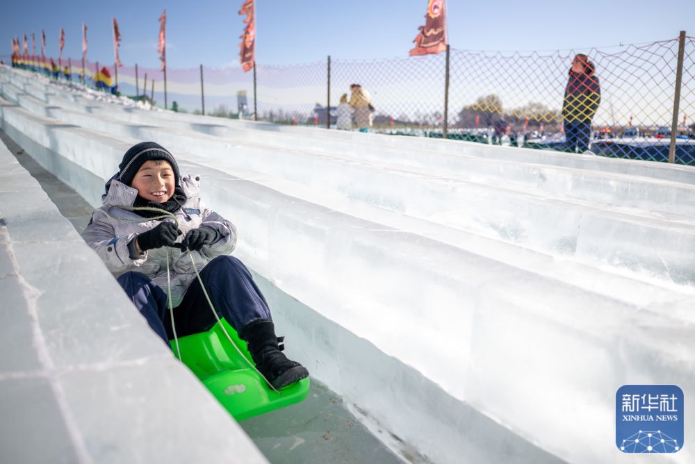 ↑ 1月10日,一名儿童在玩滑冰梯。