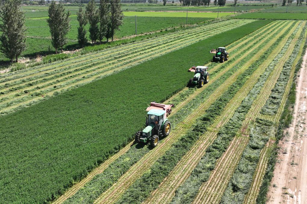 每逢夏季,在巴彦淖尔市磴口县包尔盖农场圣牧草业有机苜蓿产业园区内,近6万亩紫花苜蓿迎风摇曳,自走式割草机等大型机械来回穿梭,呈现一派繁忙的收获景象。该园区负责人李军说,他们通过优化种植结构,精准规划收获时间节点,大幅提升饲草亩均效益,确保苜蓿营养成分优、品质好、产量高,平均亩产1吨左右。