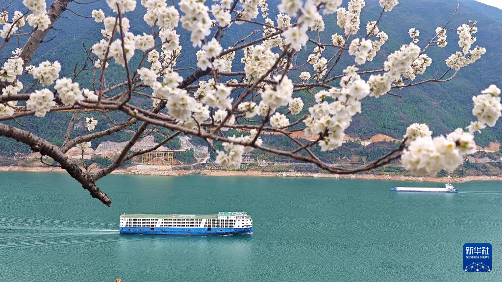 3月2日,船只航行在春花映衬下的重庆市巫山县长江巫峡水域。新华社发(王忠虎摄)