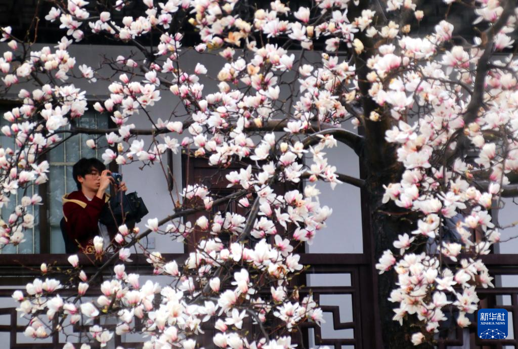 3月1日,游客在玉兰绽放的江苏省苏州市狮子林赏花游玩。新华社发(王建康摄)