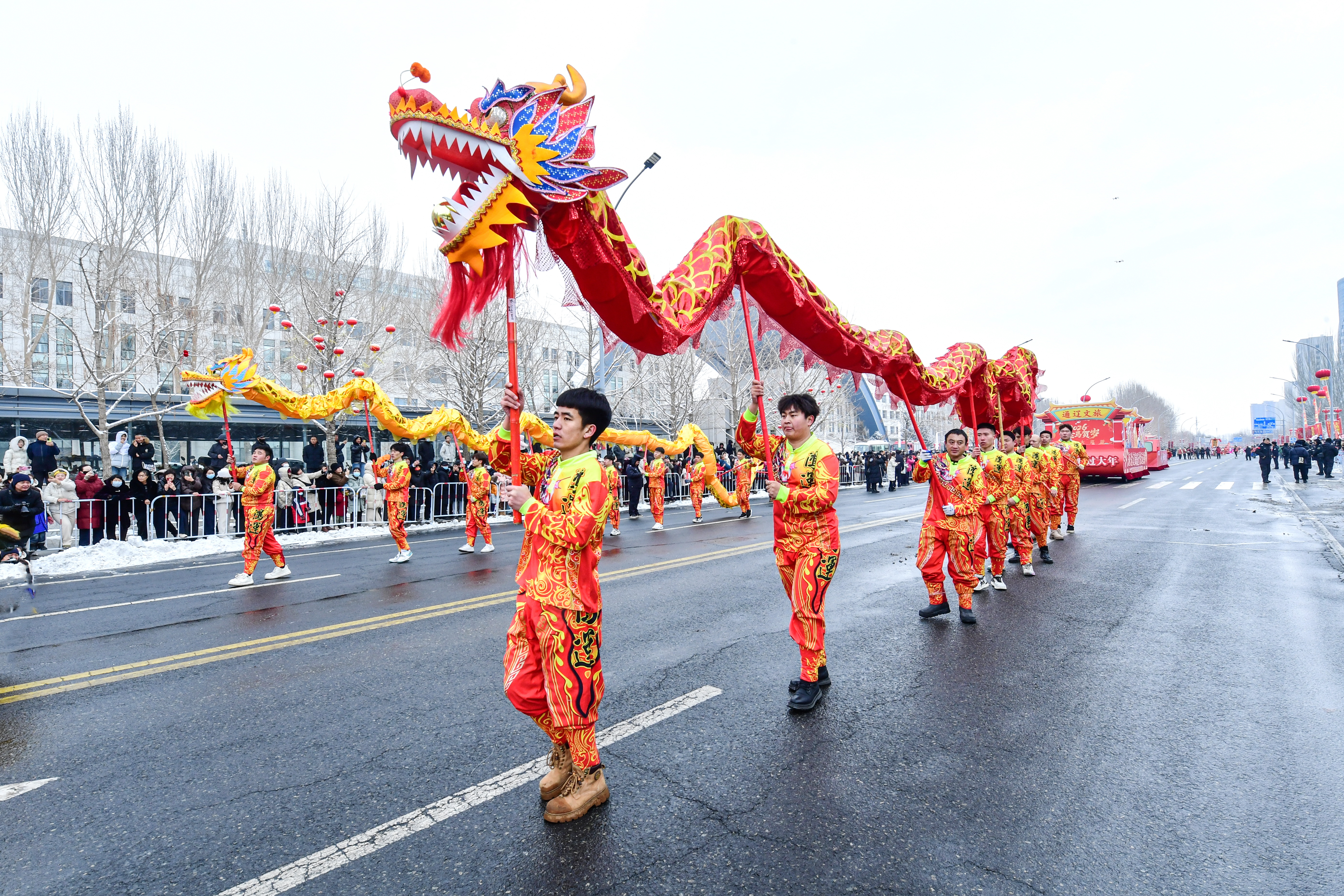 当日,尽管清晨落雪,却丝毫未减市民的参与热情。此次民俗大巡游以市政府广场为起点,行进路线由东向西,自行政中心南门到龙兴世纪城南门。来自市内外的21支表演队伍、千余名表演者身着盛装亮相。彩绸翻飞、舞龙舞狮、英歌劲舞、变脸喷火、特色花车各类非遗民俗绝活轮番登场,处处洋溢着通辽地道年味儿。