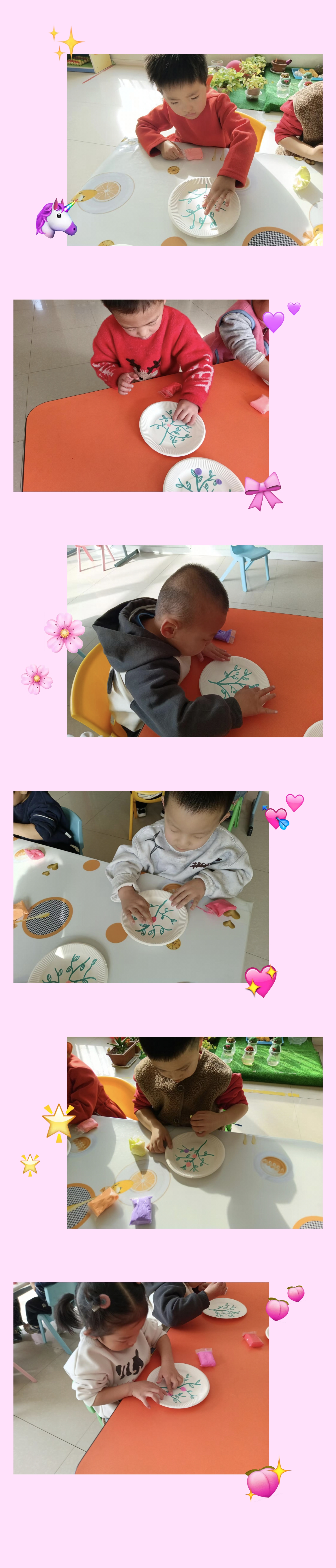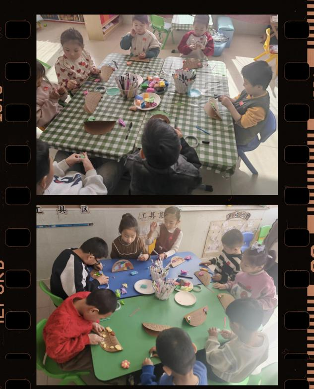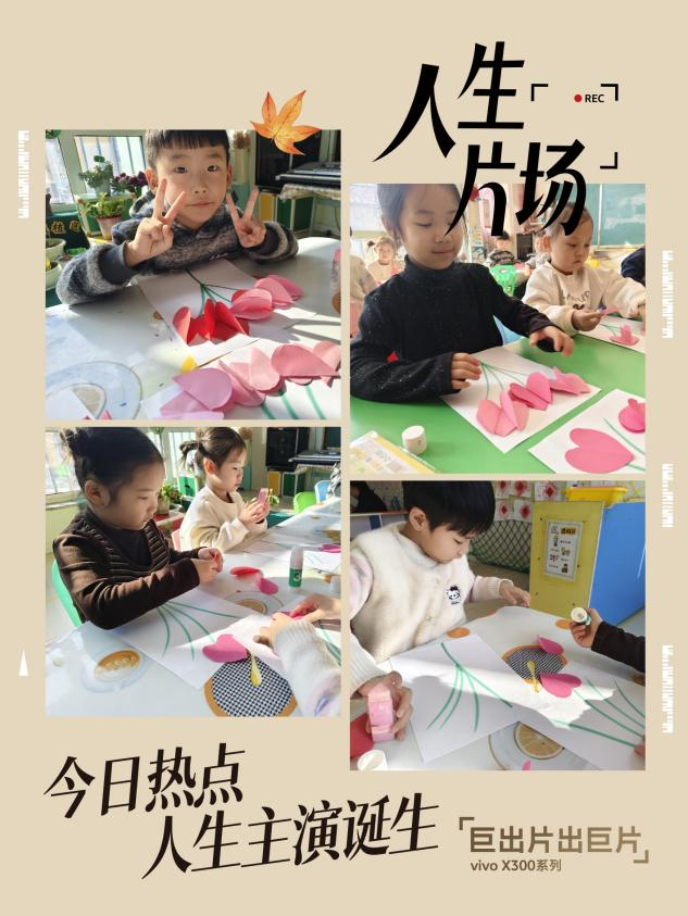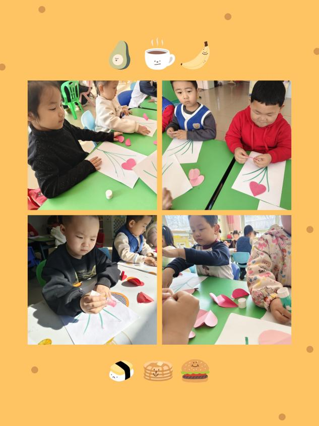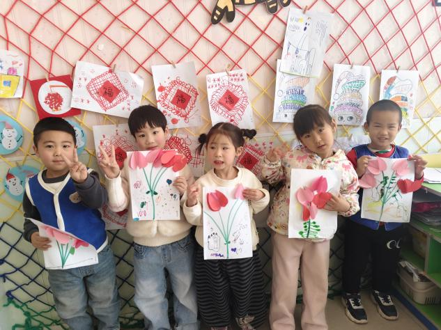 各班教室变身“创意工坊”,孩子们在老师的引导下,用灵巧的小手制作节日礼物。在手工区,小朋友们专注地剪裁粉色卡纸,将爱心形状的花瓣层层粘贴,搭配手绘的绿色花茎,制作出一朵朵立体感十足的“爱心花”;在美工区,孩子们用彩色黏土在纸盘上捏出花朵、爱心等图案,有的还添画了蝴蝶、太阳等元素,让作品充满童趣。一幅幅稚嫩却充满心意的作品,承载着孩子们对妈妈、奶奶、外婆的浓浓爱意。
