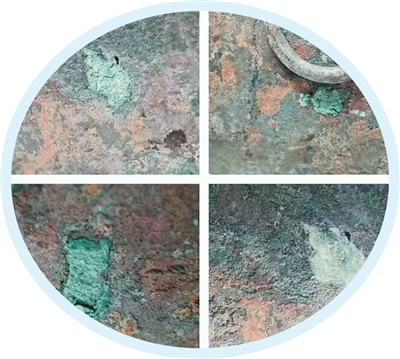 在此基础上,工作人员对铜锈样本进行硝酸银滴定实验,再决定如何开展下一步工作。“自然形成、状态稳定的锈迹也是文物历史信息的一部分,我们要按照最小干预的原则进行修复。”苏妮汗说。