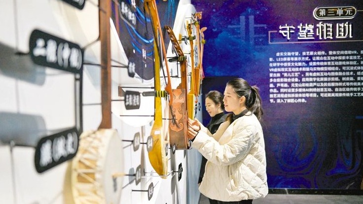 3月13日,观众在内蒙古展览馆“和合共生——内蒙古非物质文化遗产互动展示馆”参观。该展览由自治区文旅厅主办、内蒙古展览馆承办。此次展览总面积800余平方米,融合数字化展示与沉浸式互动体验,打造三大主题展区及十四个互动体验区,运用全息影像、VR、裸眼3D、AI等前沿技术,生动展示内蒙古丰富多彩的非物质文化遗产项目。