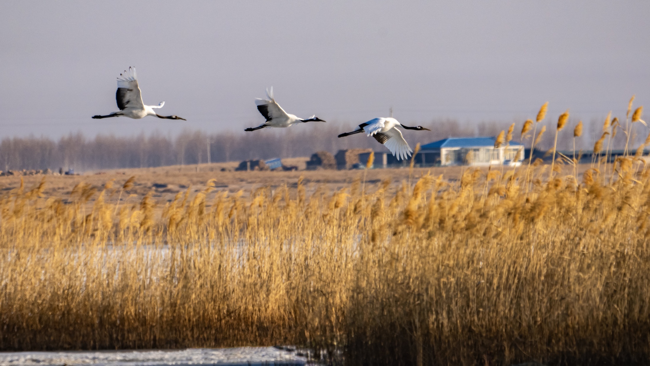 丹顶鹤振翅翱翔。(摄影:白敖敏)